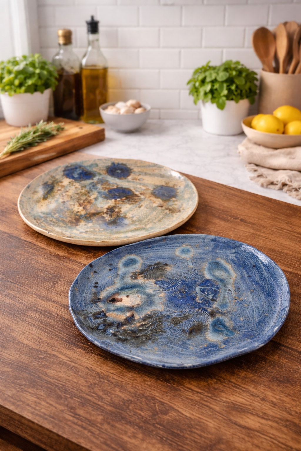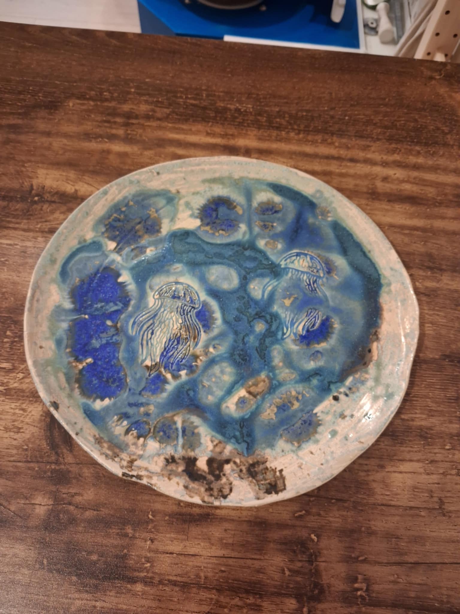 Assiette fait maison en grès et émaillées en bleu turquoise claire, ou bleu nuit.
