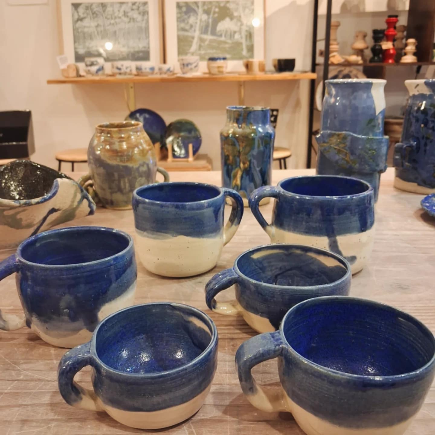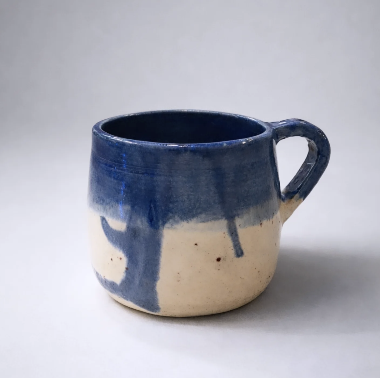Tasses bleu indigo et blanc cassé, tasses uniques pièces uniques, tournées en france, dans notre atelier de bayonne, en grès blanc lisse,